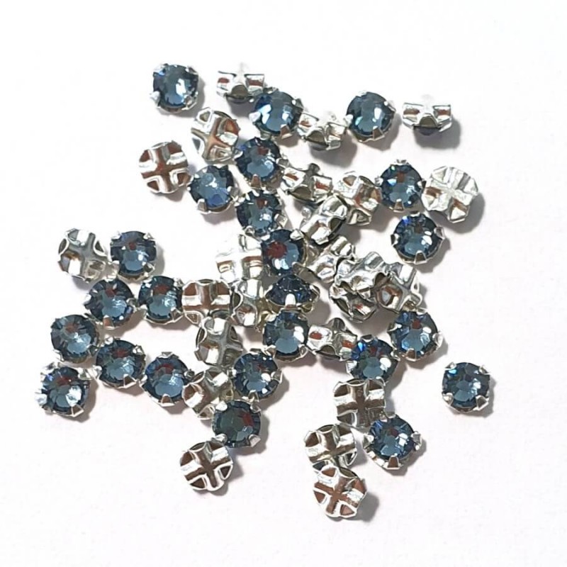 3.00-3.20 mm SWAROVSKI ELEMENTS pelēkzilas krāsas kristāli metāla ietvarā. Ietvaram aizmugurējā daļā četri caurumi divos dažādos virzienos. Sudraba pārklājums.
