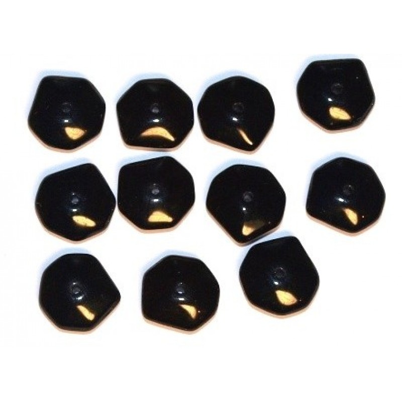 Presētā stikla pērle melnā krāsā, necaurspīdīga un gluda. Diametrā 12mm, vidus daļā aptuveni 5mm bieza. Cauruma diametrs 0,9mm. Cena par gab.