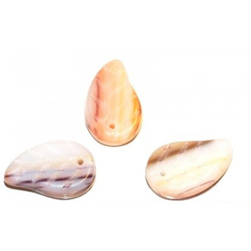 Presētā stikla pērle, necaurspīdīga, pamatā balta ar oranžīgu un pelēcīgi violetu tonējumu.