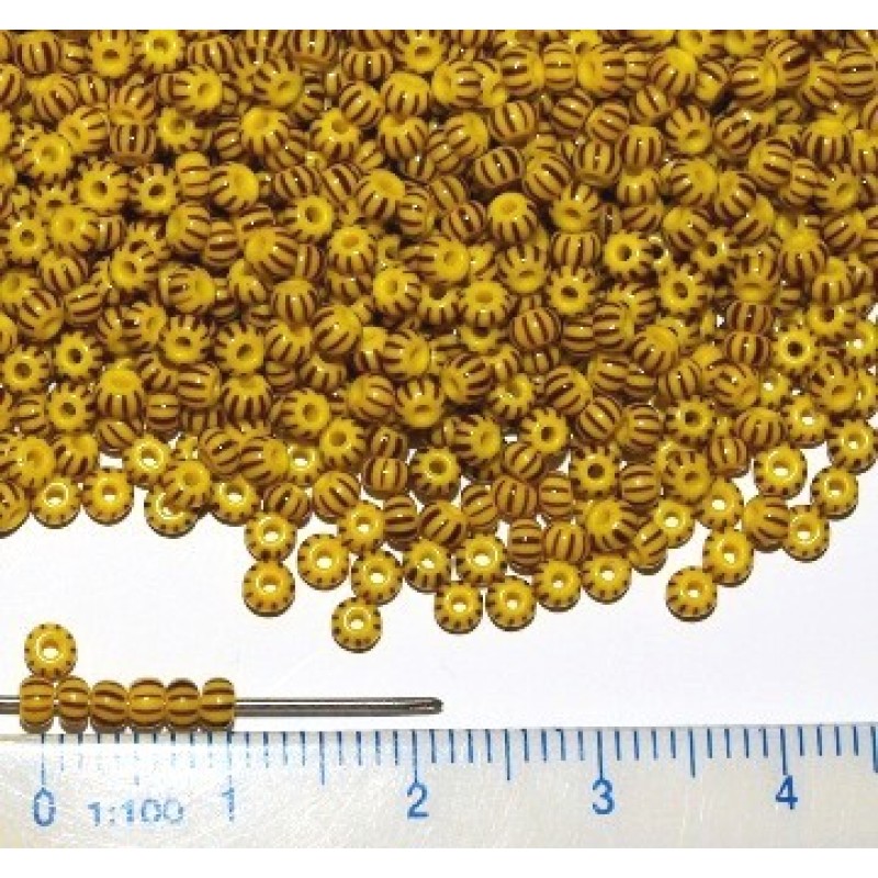Necaurspīdīgas, mazas čehu stikla sēkliņpērlītes koši dzeltenā krāsā ar tumši brūnu svītrojumu. Pērlītes diametrs ir aptuveni 2.5mm, augstums nepilni 2mm, caurums ap 0.5mm. 20g iepakojums satur +/- 1230 pērlītes.