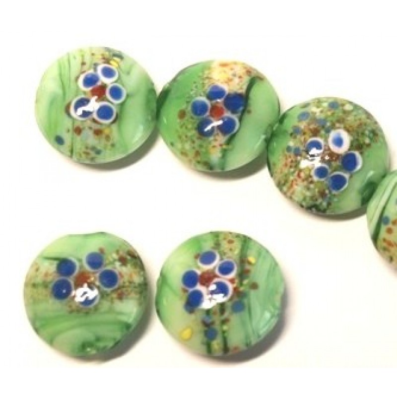 Itālijas stila pūstā stikla pērle 20mm diametrā, biezums aptuveni 7mm. Pērles raksts veidots pērles pūšanas gaitā, pērle gandrīz gluda.