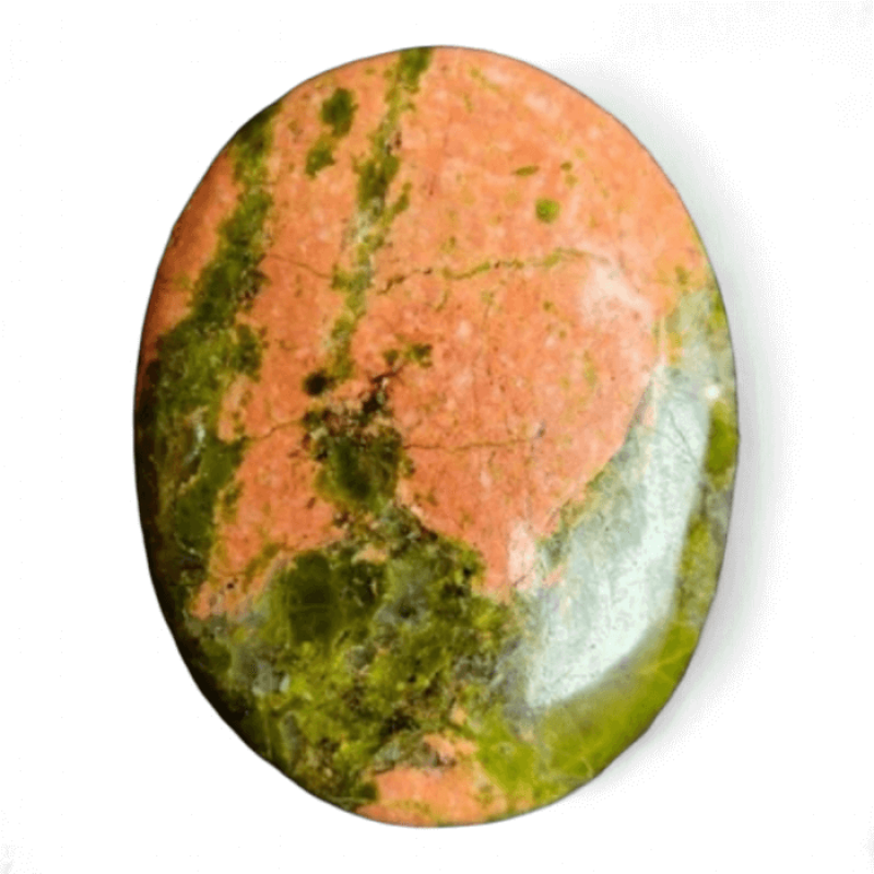 Dabiskais unakīts, ovālas formas. Izmērs: 22x30mm, 7-7.5mm biezs, ar gludu virsmu.