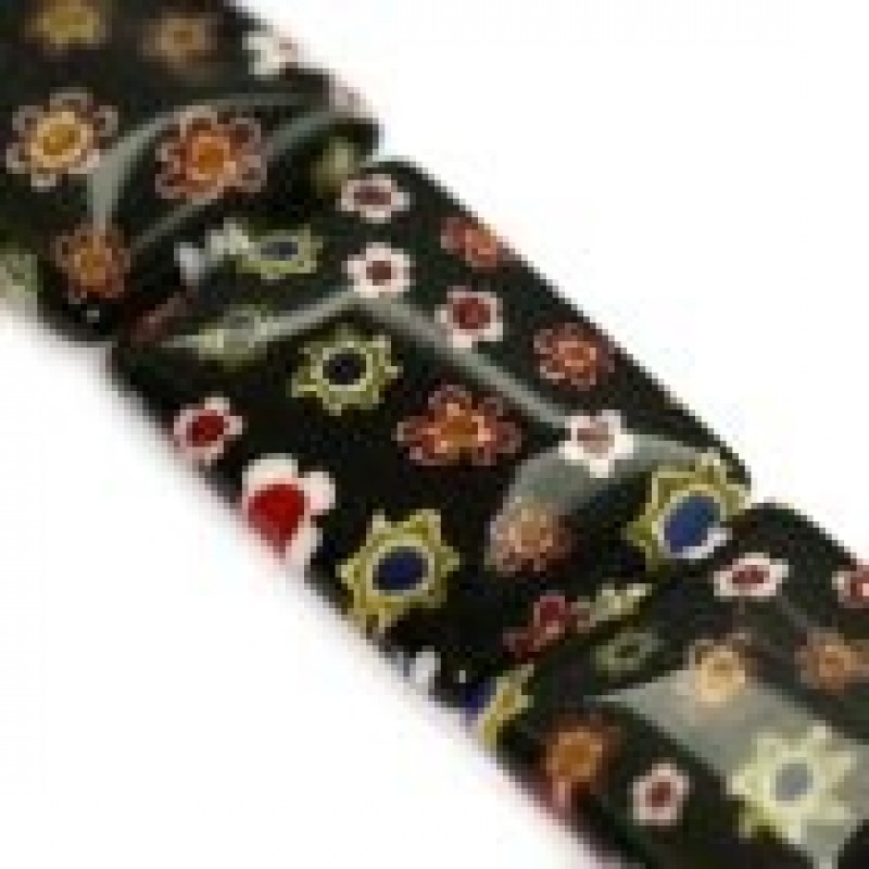 Melna millefiori pērle ar krāsainu puķu zīmējumu. Pērles izmērs 23x18mm, cauruma diametrs aptuveni 1mm.