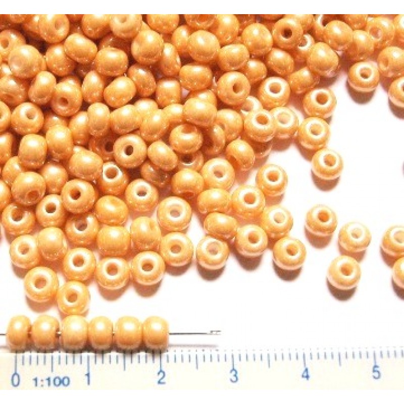 Salīdzinoši liela, necaurspīdīga čehu stikla pērle tumši bēšā krāsā ar perlamutra pārklājumu. Savērtas trīs pērles ir aptuveni 1cm, pērles diametrs ir aptuveni 5mm. Caurums ~1.5mm, forma drīzāk vienāda. 16g.