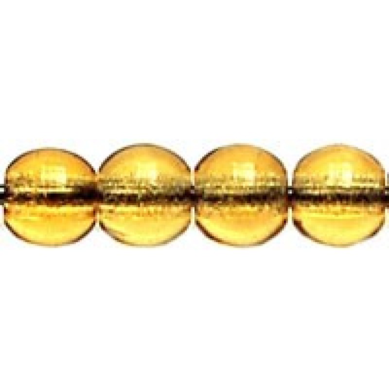Caurspīdīga, gaiša dzintara krāsas pērle. Attēlā redzamās uzvērtas uz tumšas auklas. Cena par 20.