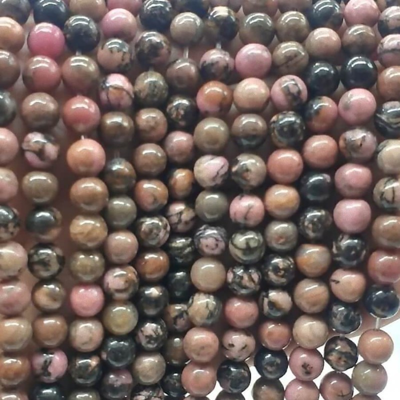 Apaļas dabīgā rodonīta pērles 6mm diametrā ar melnu dzīslojumu.