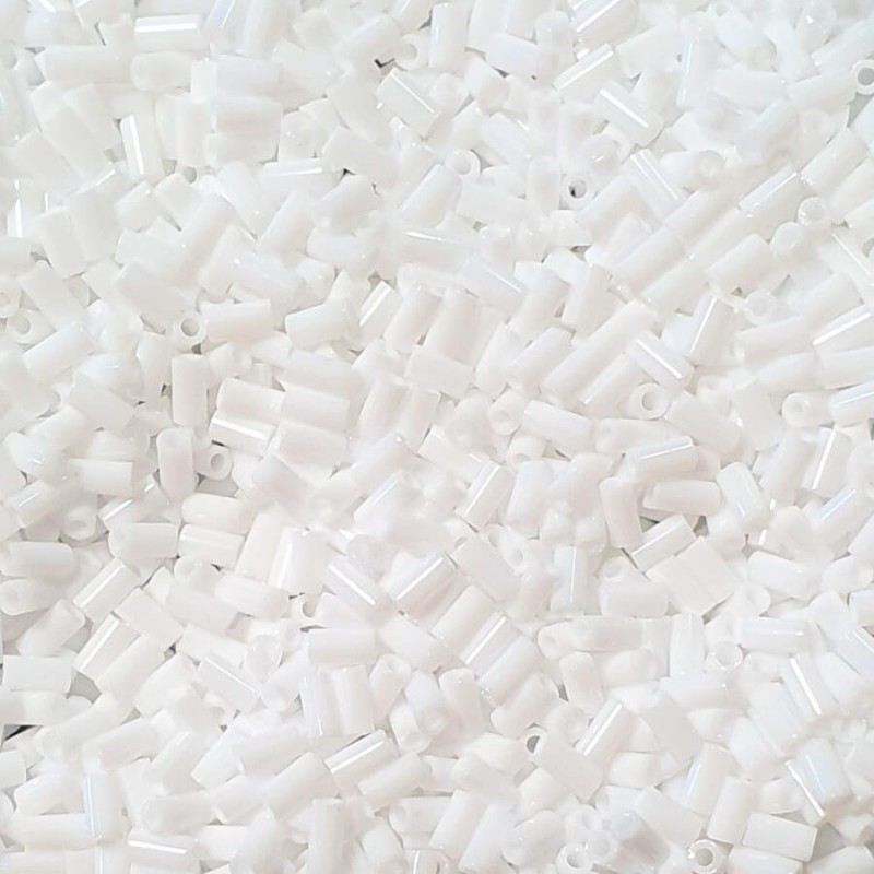 3mm garas, necaurspīdīgas stikla pērlītes - salmiņi, cauruma diametrs aptuveni 0.5mm, baltā krāsā.