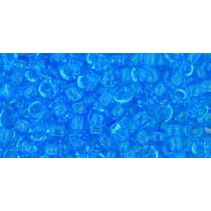 Caurspīdīga, tumši ūdenszila stikla pērlīte, apmēram 3 mm diametrā.