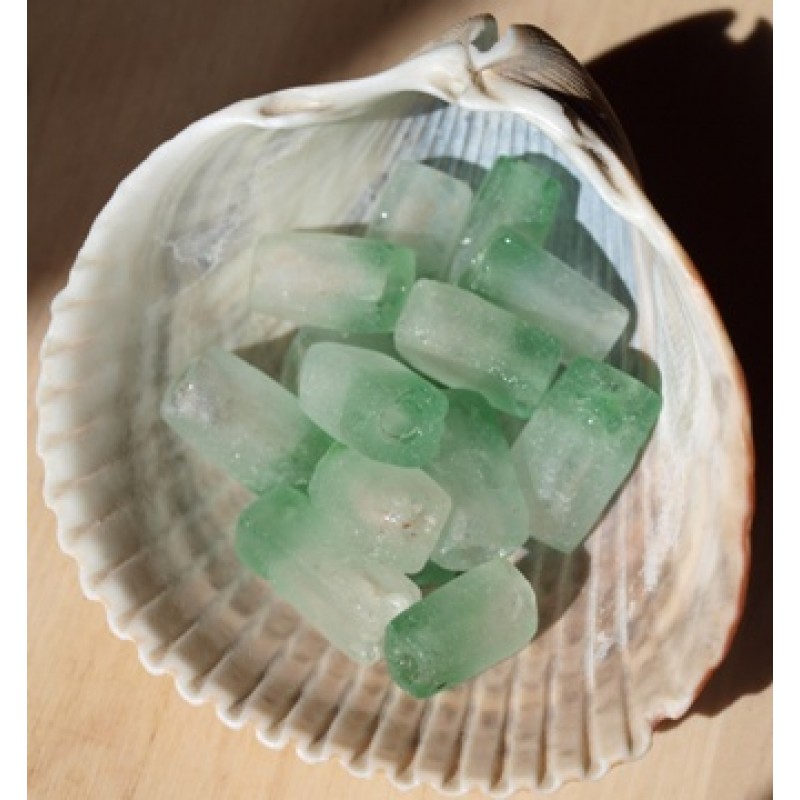 Četrstūrveida pērles no pārstrādātā stikla. Viens pērles gals matētā baltā krāsā, otrs ietonēts zaļgans. Izmērs 22x7mm. Cena par gab.