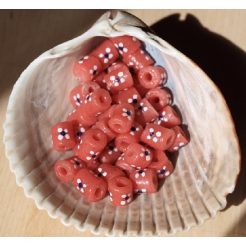 Kičīga, vidēja izmēra pārstrādātā stikla pērle sarkanīgi rozā krāsā ar uzzīmētu puķīti. Pērle ir 100% roku darbs, tās izmērs 10x9 mm. Cena par gab.