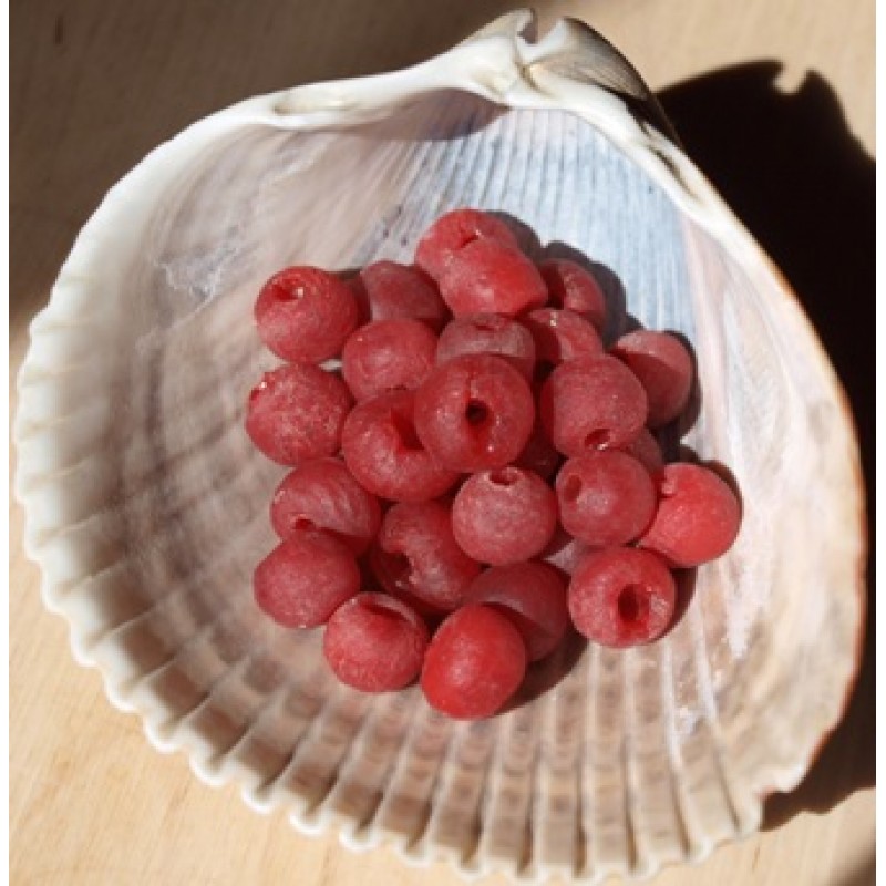 Sarkanas krāsas matētas, pret gaismu caurspīdīgas, apaļas pārstrādātā stikla pērles. Diametrs 8-11 mm. Cena par gab.