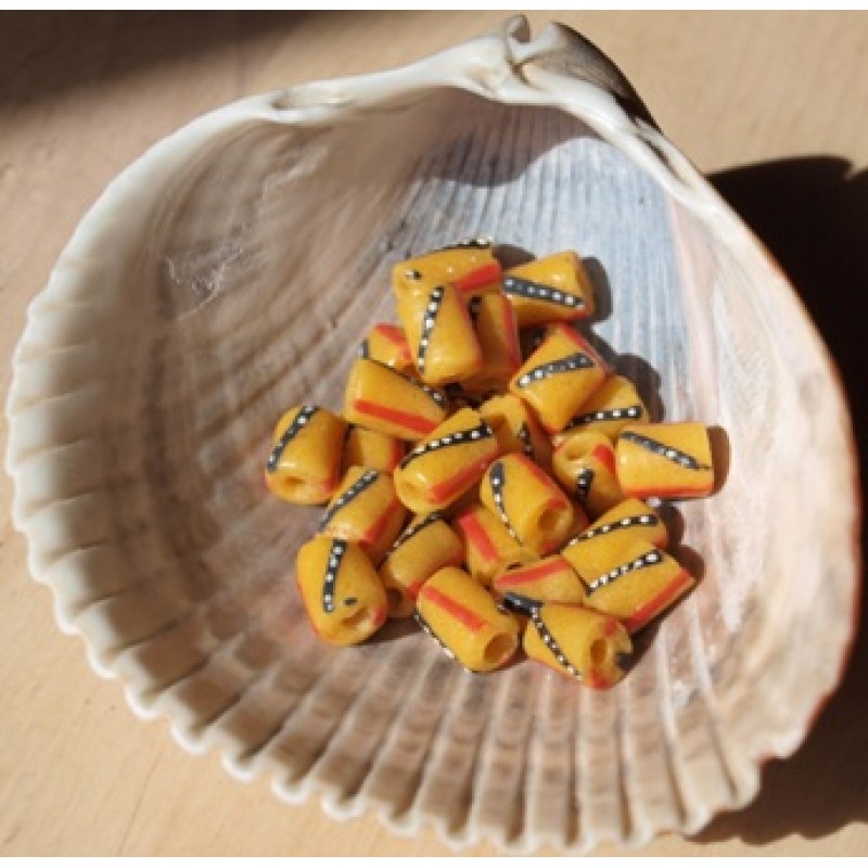Pamatā dzelteni oranžā krāsā pārstrādātā stikla pērle, nav caurspīdīga, apgleznota ar sarkaniem un melniem elementiem. Pērles izmērs - 11x7 mm. Cena par gab.
