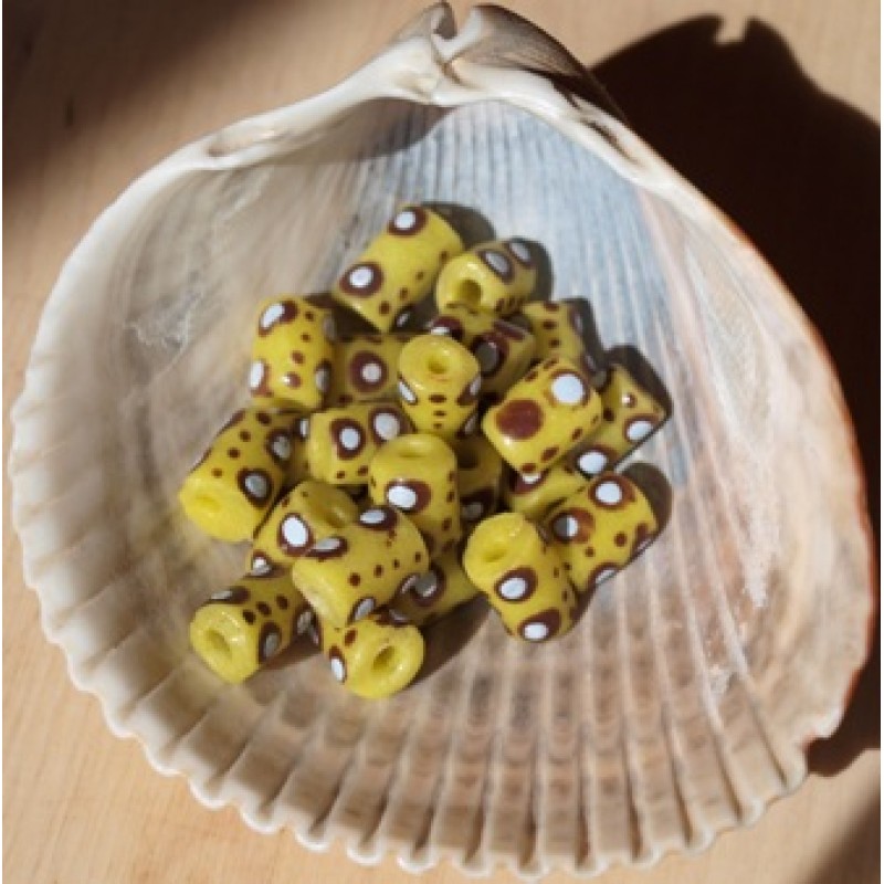 Dzeltenas krāsas pārstrādātā stikla pērle, apzīmēta, nav caurspīdīga. Izmēri var atšķirties, aptuveni 13x7mm. Pērle ir nedaudz ieliekta. Cena par gab.