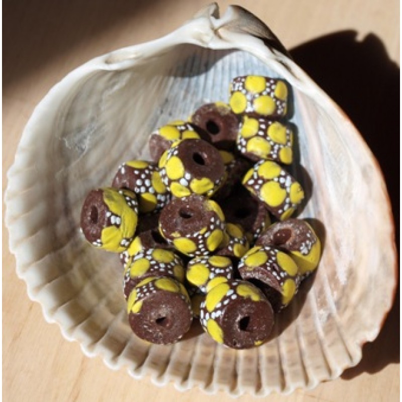 Jaukas, vidējas, tumši brūnas pārstrādātā stikla pērles, apgleznotas ar dzeltenu un baltu rakstu. Pērles izmērs - 10x14 - faktiski pērle ir lielāka diametrā. Cena par gab.