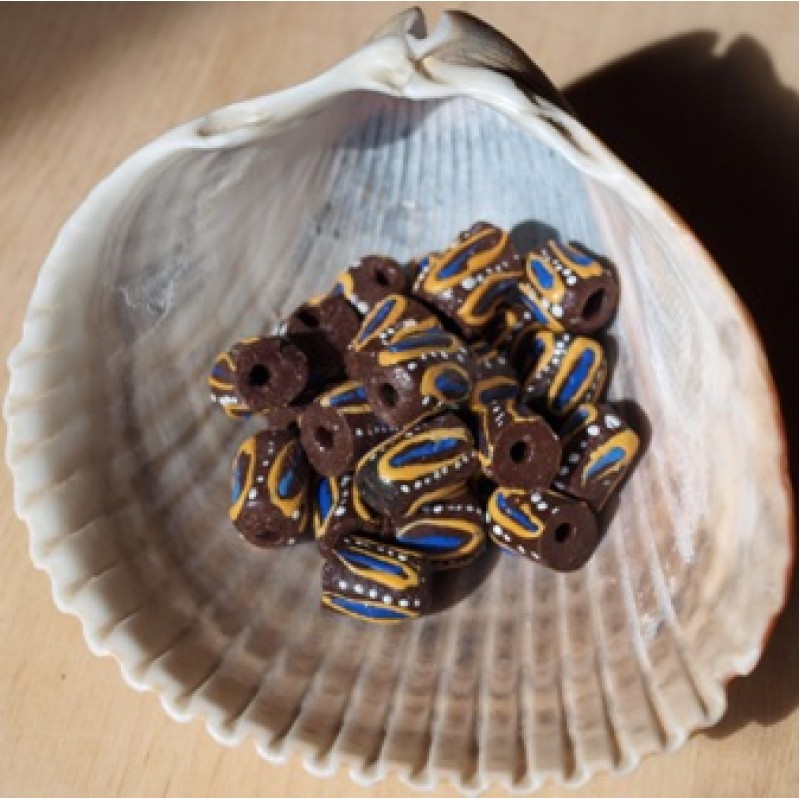 Šokolādes krāsas pārstrādātā stikla pērle ar uzzīmētu rakstu. Aptuvenais pērles izmērs 10x7mm. Cena par gab.
