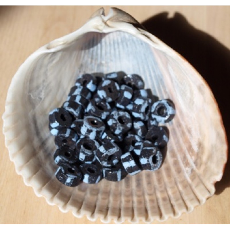 Salīdzinoši mazas, melnā stikla Ganas pērles ar zilu svītrojumu. Var izmantot kā starpliku. Pērles izmērs var atšķirties. Aptuvenais biezums 3-4mm, diametrs aptuveni 10mm. Cena par 1 gab.