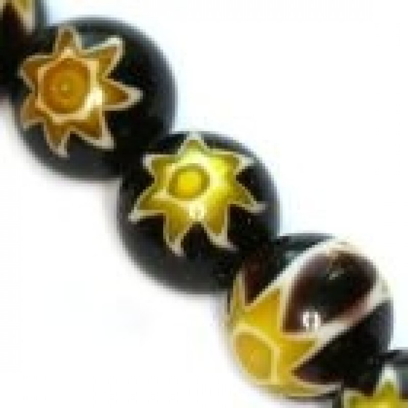 Melna millefiori bumbiņa ar dzeltenu puķi. Puķes krāsa un izmērs uz katras bumbiņas var atšķirties. Caurums aptuveni 1mm.