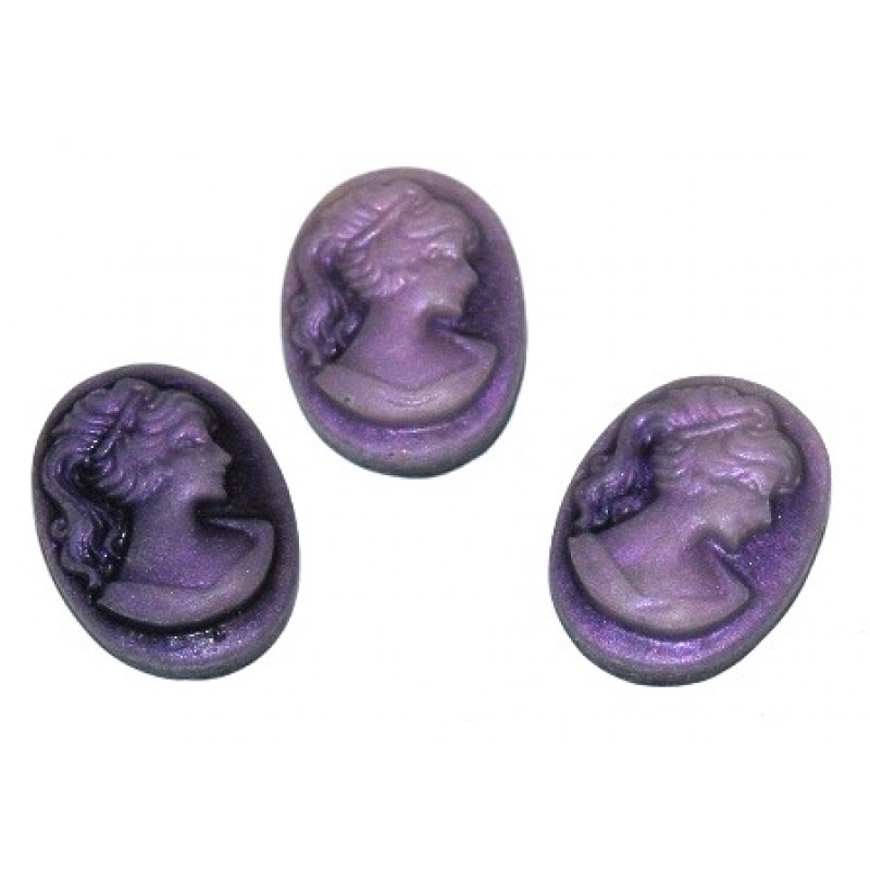 Ovāla plastmasas violetas krāsas kameja ar izgrebtu sievietes galvu profilā, bez cauruma. Izmērs 18x13mm, cena par gab.