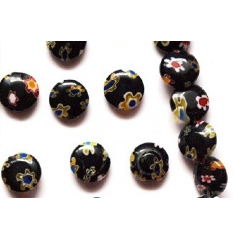 Apaļa, saplacināta millefiori pērle melnā krāsā ar ziedu rakstu. Ziedu krāsa un raksts uz katras pērles var atšķirties.