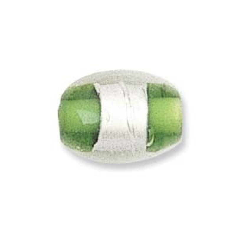 Gaiša stikla Indijas pērle, kuras "sirsniņa" ir zaļā krāsā un aptīta ar folliju. Pērles garums ir 14 mm, caurums aptuveni 2 mm.