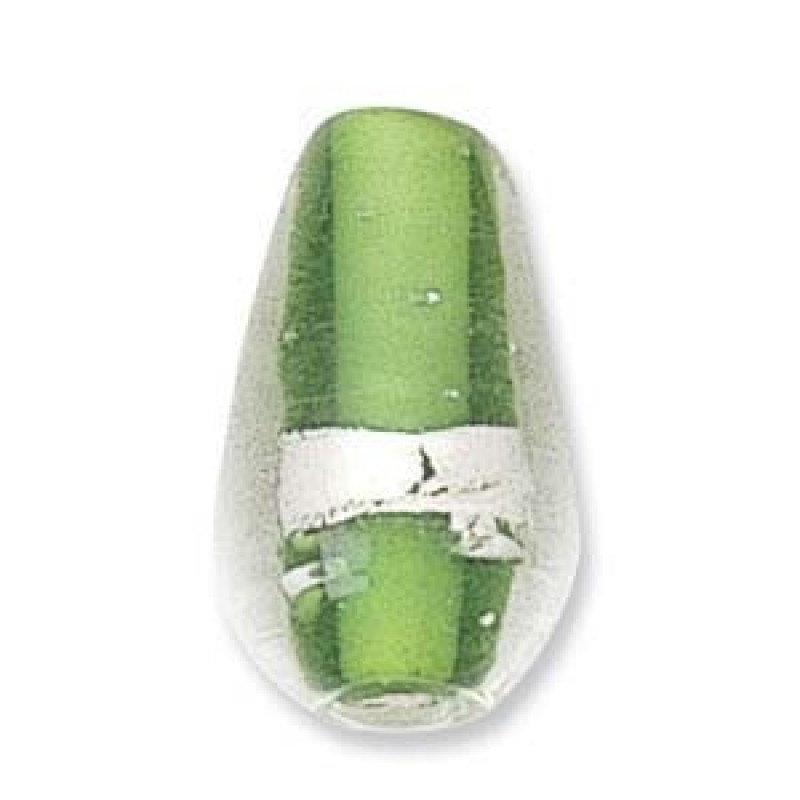 Cena norādīta par pērli. Gaiša stikla pērle, kuras "sirsniņa" ir zaļā krāsā aptīta ar folliju.
