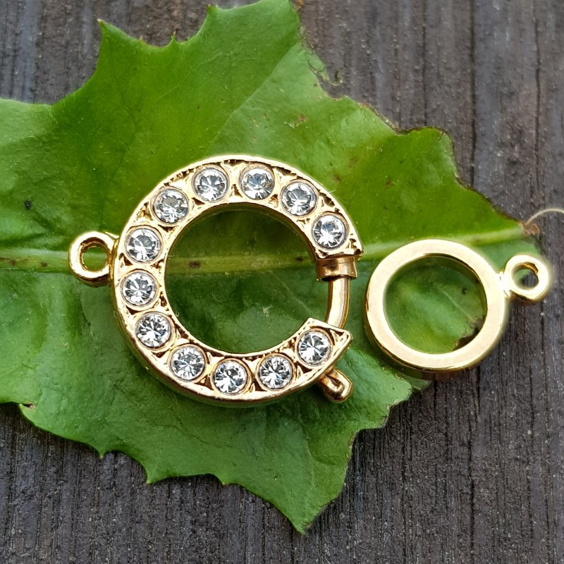15mm 1-rindas elites klases aizdare gredzens ar SWAROVSKI kristāliem, zelta pārklājums. Šo Elegant ELEMENTS vācu kvalitātes aizdari var izmantot ne tikai kā aizdari, bet arī kā centrālo elementu greznai kakla rotai!