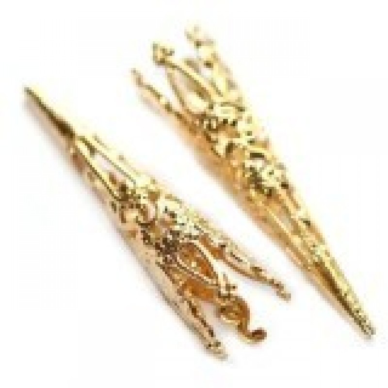 Zelta pārklājuma filigrāns pērļu konuss ar vertikālu caurumu spicē, 40mm garš (platākā gala cauruma d=10mm). Cena par gab.