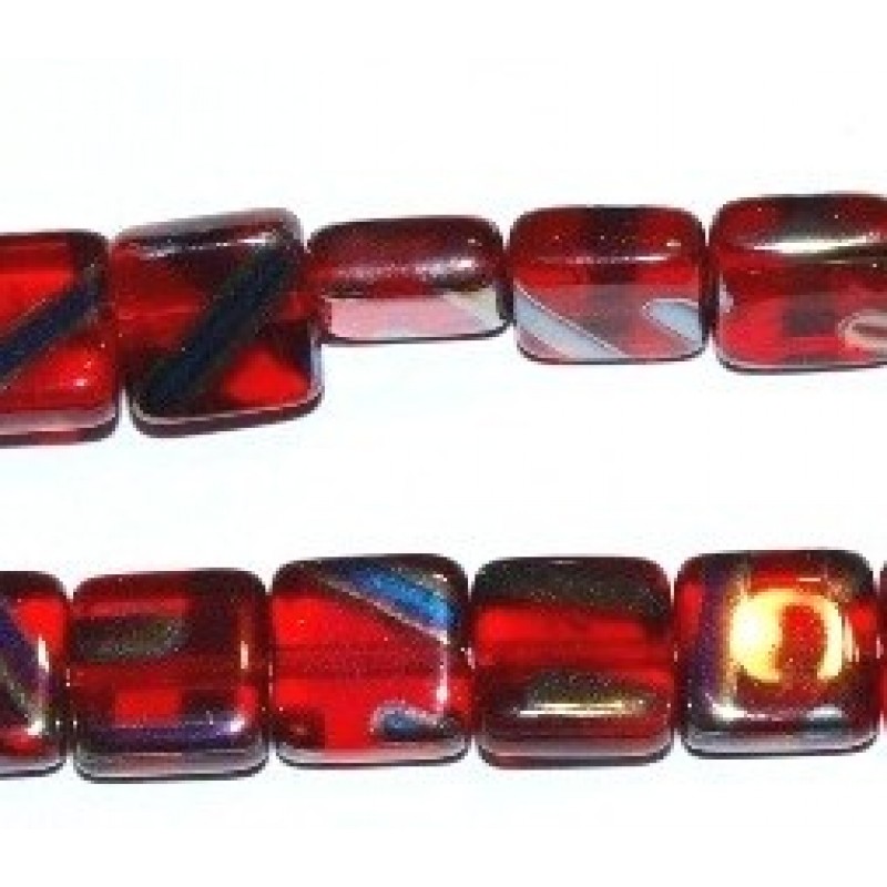8x8mm sarkanas krāsas, caurspīdīgs, plakans kubs ar zeltainas varavīksnes krāsas svītrojumu. Cena par gab.