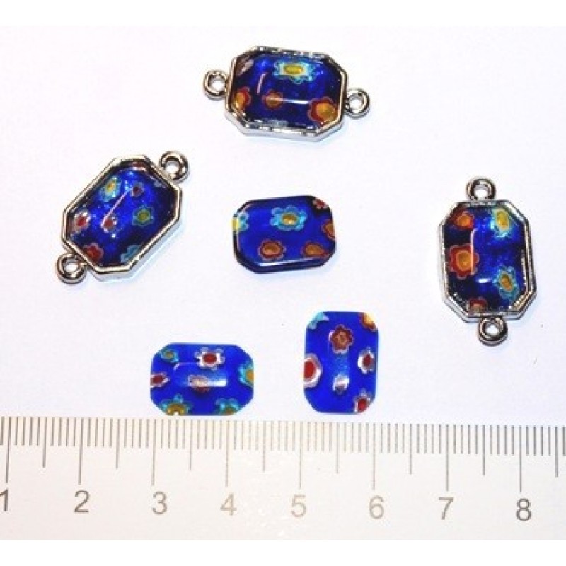 Millefiori stila 14x10mm kabašons zilā krāsā ar ziedu rakstu. Stūri nedaudz nošķelti. Cena par gab (bez attēlā redzamās kabašonu pamatnes).