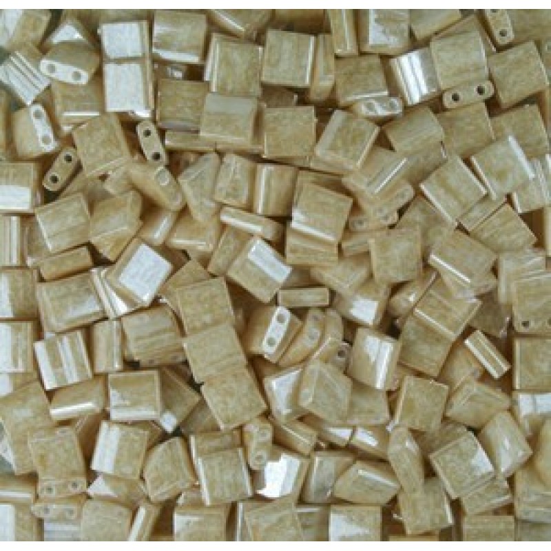 Divu caurumu Tila pērles. To izmērs ir 5x5x1.9 mm un katrai pērlei ir divi paralēli 0.8mm lieli caurumi. Vienā gramā ir aptuveni 12 Tila pērles. Tieši tā pat kā citas pērles no Miyuki, arī šīs ir vienādas pēc izmēra un formas. Cena par 5 g iepakojumu (+/- 60 pērles, atkarīgs no pārklājuma).