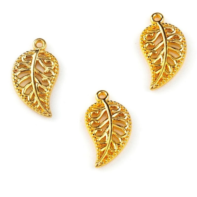 Divpusējs metāla piekariņš filigrāna lapa zelta krāsā.