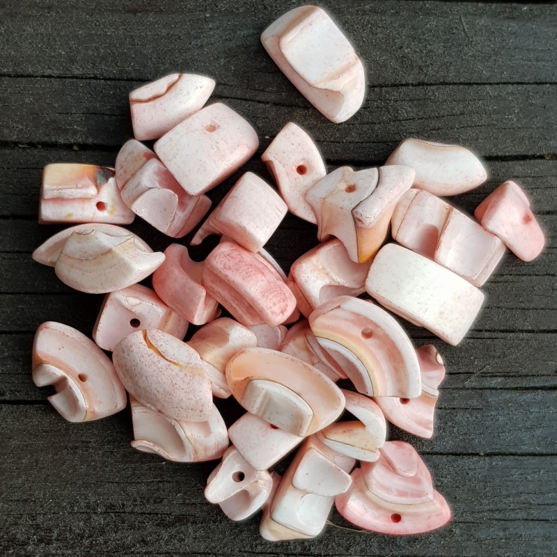 Dabisko gliemežnīcu šķembas, tonētas rozā krāsā. Izmērs un krāsu tonis atšķiras un nav uzskatāms par defektu. Katram šķembas gabaliņam ir caurums. Tas var būt izveidots jebkurā vietā, un asimetrija nav uzskatāma par defektu. Cena norādīta par 30 g iepakojumu, kurā ir 20 - 25 šķembas izmērā no 0.7-1.5 cm.
