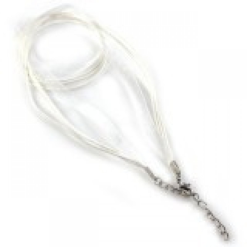 Baltas krāsas kaklarota, kas veidota no 6mm organzas lentas, kokvilnas auklas, aizdares un pagarinājuma ķēdītes. Kopējais garums 49 cm. Cena par gab.