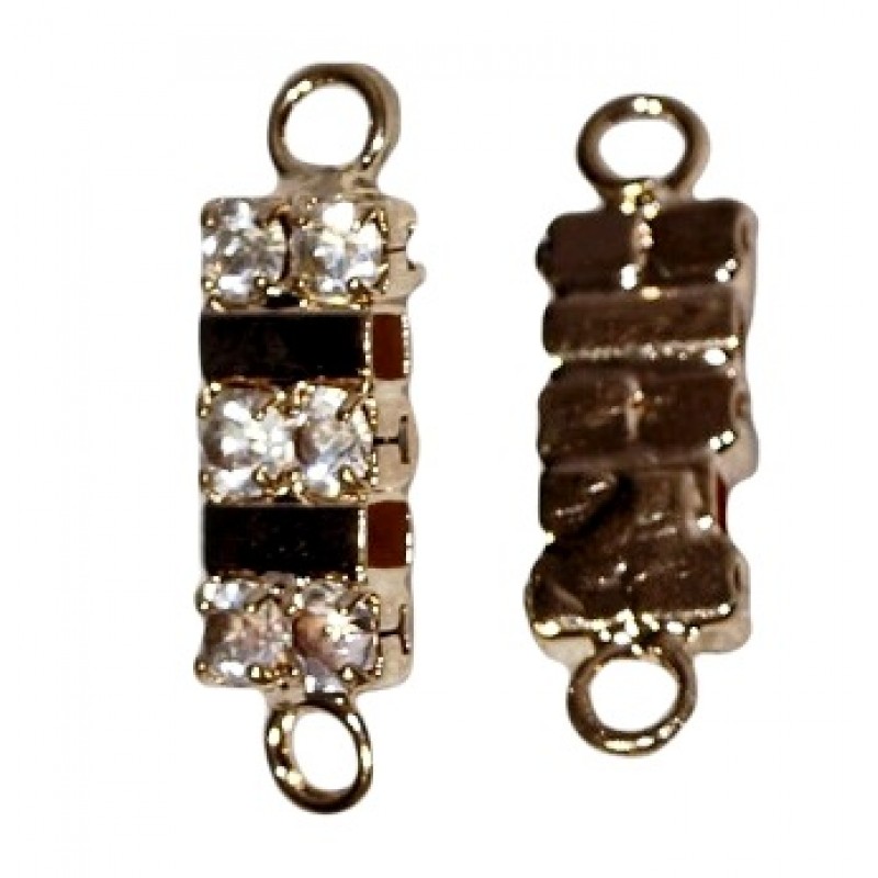 1->1 taisnstūra savienojums ar stikla kristāliņiem, izmērs 6x20mm, augstums 3mm, cilpu diametrs aptuveni 2mm. Cilpas nav atveramas. Materiāls - misiņs ar zelta krāsas pārklājumu. Nesatur niķeli, svinu un kadmiju.