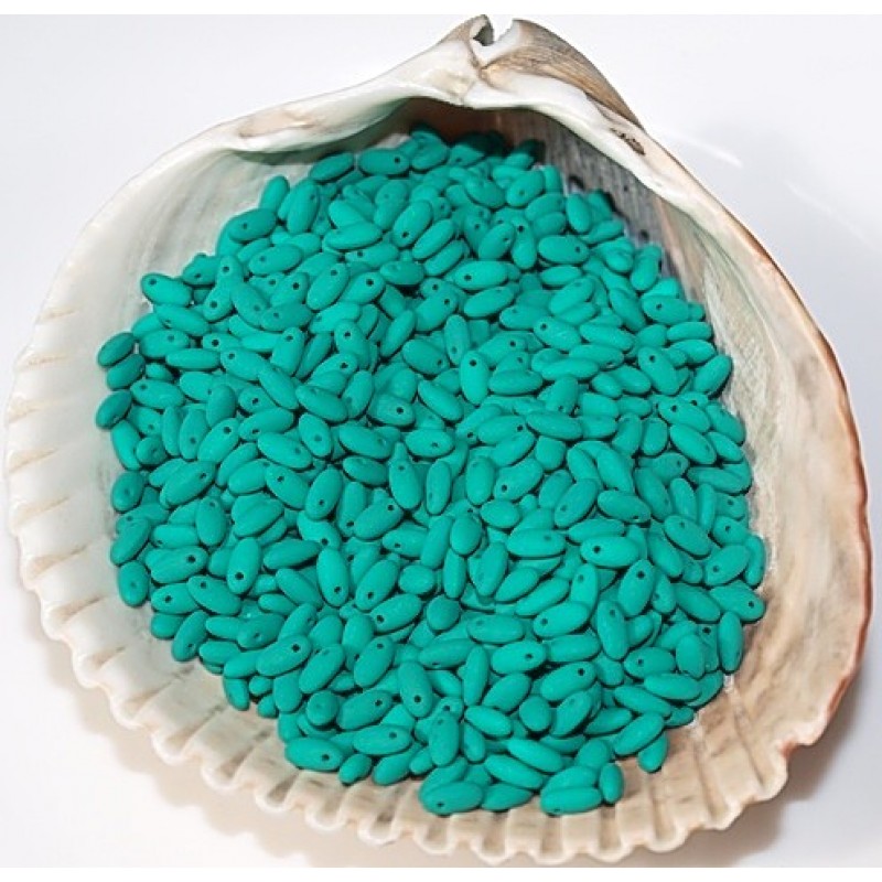 Iepakojumā matētas neona zilganzaļas krāsas pērles. Tabulā Nr.9 krāsa. Cena par 5g - aptuveni 73 pērles.