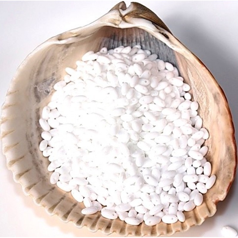 Iepakojumā necaurspīdīgas, baltas krāsas pērles. Cena par 5g - aptuveni 73 pērles.