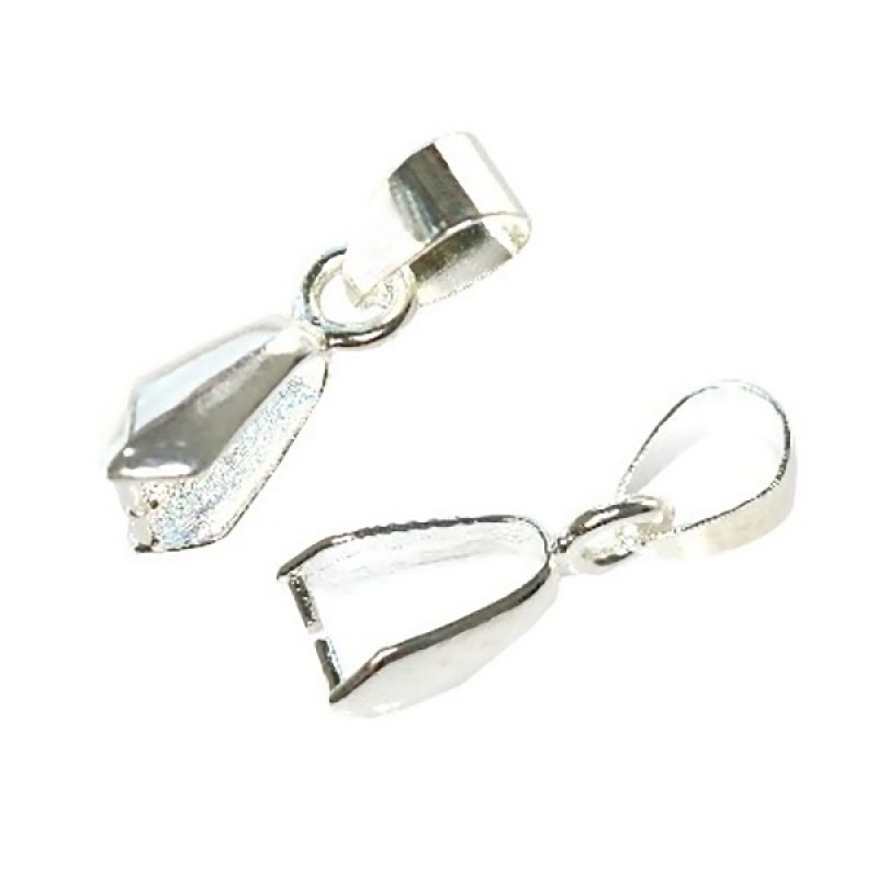 Mazs, divpusējs misiņa satvērējs ar cilpu, kopējais garums 11mm, piliena garums 4mm. Pilnībā aizvērtas skavas platums aptuveni 2mm, cilpas izmērs 6x5mm. Sudraba krāsā. Piemērots maziem kuloniem. Cena par gab.