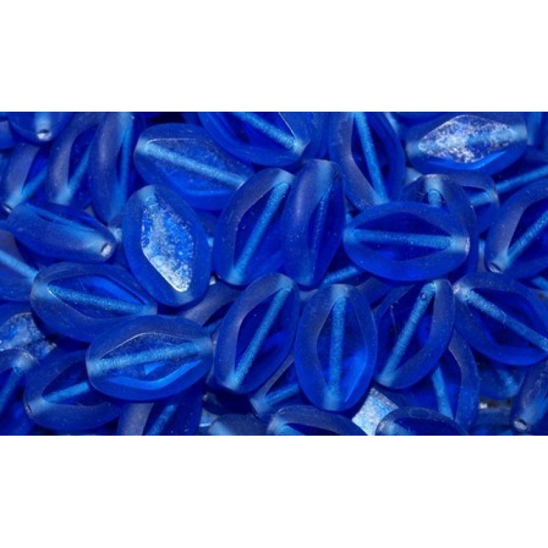 Matēta, caurspīdīga, čūskas acs formas stikla pērle tumš safīra krāsā. Divas skaldītas virsmas. Izmērs 15x9mm, cena par gab.