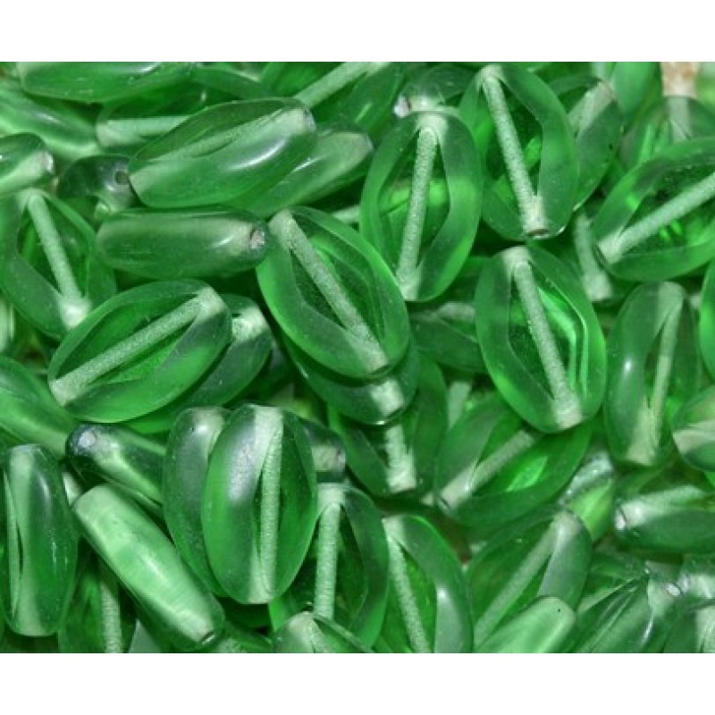 Caurspīdīga, matēta zaļas krāsas čūskas acs formas pērle ar skaldītām divām virsmām. Izmērs 15x9mm, cena par gab.
