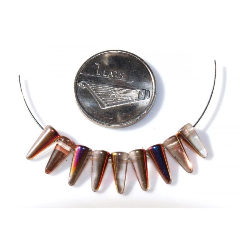 Konusa formas pērle, caurums platākajā galā, izmērs 4x10mm. Krāsa - crystal sliperit - caurspīdīga pērle, kas no vienas puses noklāta gan ar vitrail (metāliskas varavīksnes) efektu, gan ar rozā zelta metālikas efektu. Rezultātā pērle iegūst vara rozā nokrāsu ar izteiktu sarkani metālisku varavīksnes efektu no vienas puses.Cena par gab.