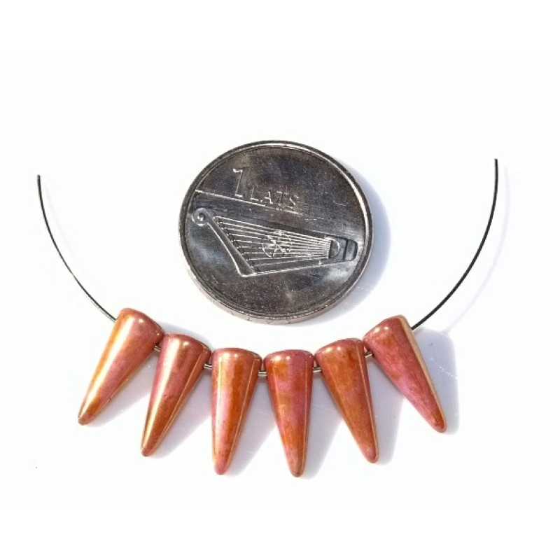 Konusa formas pērle, caurums platākajā galā, izmērs 5x13mm. Krāsa - netīri rozā ar zeltainu pārklājumu - necaurspīdīga. Cena par gab.