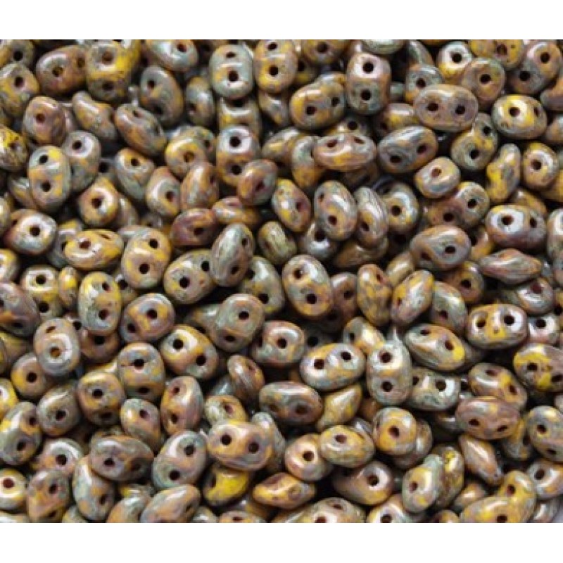 SuperDuo - divu caurumu pērles, precīzas, ideāli pieguļ viena otrai. Krāsa - dzeltens Pikasso, necaurspīdīgas. Pērlīšu izmērs 2.5x5mm. Cena par 10g (aptuveni 130 gab).
