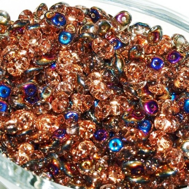 Rozīgas Super Duo pērlītes ar zelta varavīksnes pārklājumu no vienas puses, caurspīdīgas.
