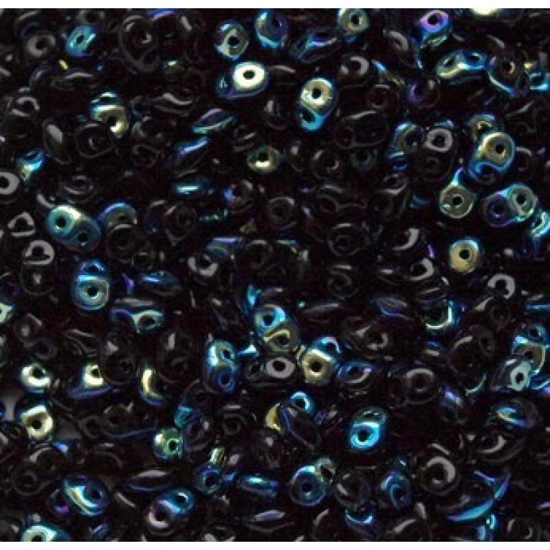 SuperDuo - divu caurumu pērles, precīzas, ideāli pieguļ viena otrai. Krāsa - melns ar AB pārklājumu no vienas puses, necaurspīdīgas. Pērlīšu izmērs 2.5x5mm. Cena par 10g (aptuveni 130 gab).