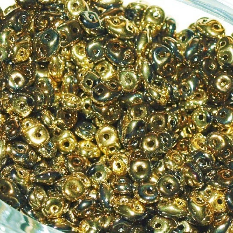 SuperDuo pērlītes melnā krāsā ar metālisku zelta pārklājumu no vienas puses un tumši pelēcīgas metālikas pārklājumu no otras puses (diena - nakts imitācija), necaurspīdīgas.
