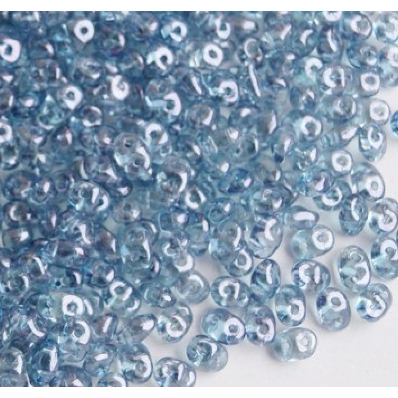 SuperDuo - divu caurumu pērles, precīzas, ideāli pieguļ viena otrai. Krāsa - caurspīdīgs, gaiši zils tonis ar spīdumu. Pērlīšu izmērs 2.5x5mm. Cena par 10g (aptuveni 130 gab).