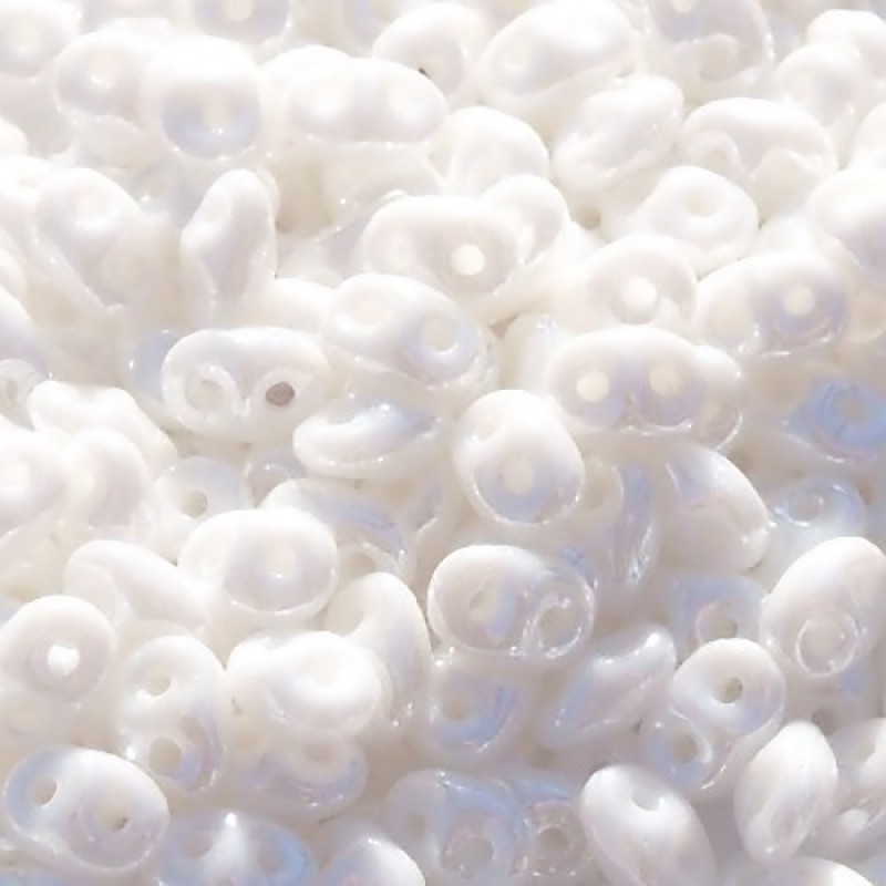 SuperDuo - divu caurumu pērles, precīzas, ideāli pieguļ viena otrai. Krāsa - balta ar perlamutra spīdumu, necaurspīdīga. Pērlīšu izmērs 2.5x5mm. Cena par 10g (aptuveni 130 gab).