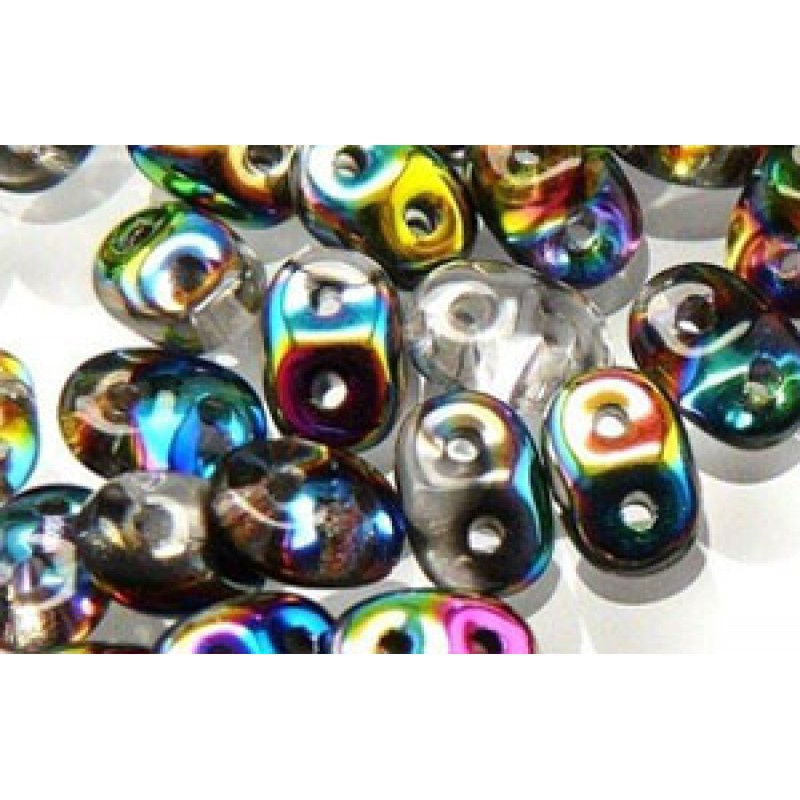 SuperDuo - divu caurumu pērles, precīzas, ideāli pieguļ viena otrai. Krāsa - kristāls ar ļoti izteiktu varavīksnes efektu. Pērlīšu izmērs 2.5x5mm. Cena par 10g (aptuveni 130 gab).