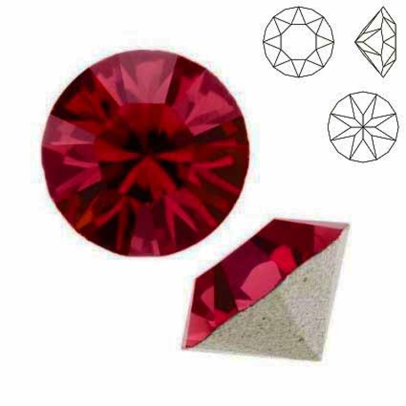 Rubīnsarkanas krāsas SWAROVSKI kristāls ar sudraba folija aizmuguri papildus mirdzumam.
