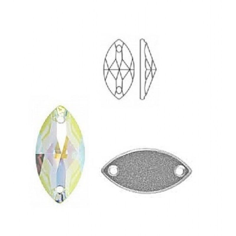Piešujams acs formas SWAROVSKI ELEMENTS kristāls, divi caurumi, dabiskā krāsā ar AB pārklājumu, no aizmugures spogulis papildus mirdzumam.
